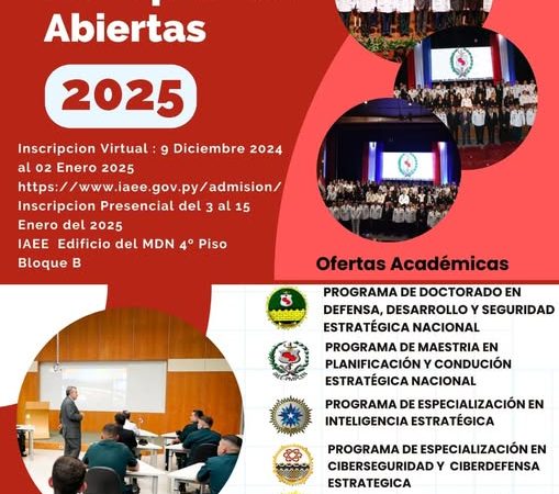 Inscripción Virtual: desde el 9 de diciembre del 2024 al 2 de enero del 2025, se deberá realizar la Pre – Inscripción (virtual), a través de la página Web https://www.iaee.gov.py/admision/